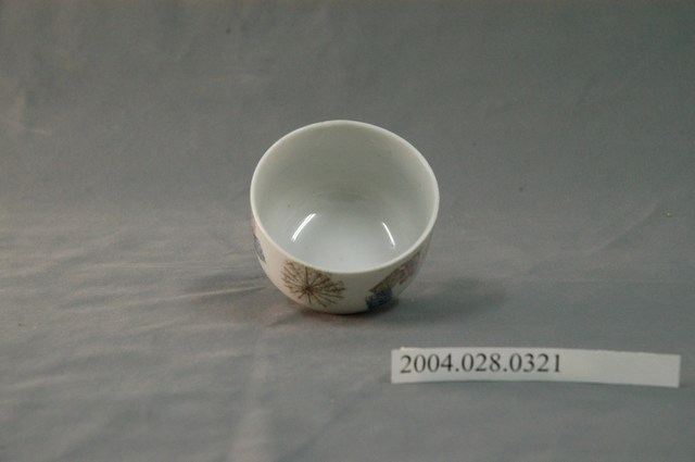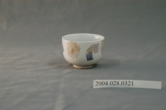 1.本文物為花紋小瓷杯,這個杯子大約7.5公分大小,高約5公分,除了杯子本身之外,並未附有茶杯蓋,杯身主要有方型圖案和煙花放射狀圖案,顏色有金色、粉色、藍色與橙色。整體瓷杯屬於敞口短圈足式。小瓷杯本身保存良好,杯底有髒污,屬白瓷。