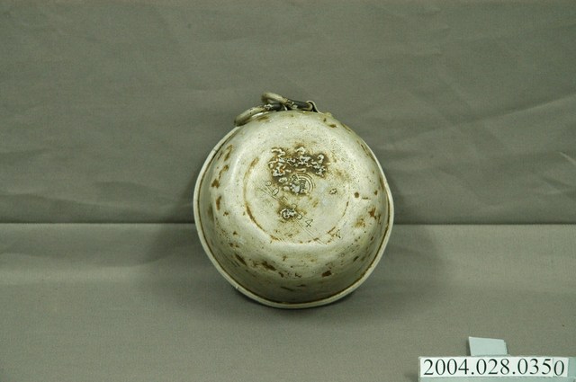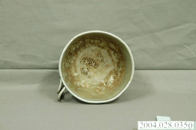 1.本文物為軍用鋁杯,長約14.9公分,寬約12.4公分,高約7.1公分,整體形制完整,有一提把,並無過多裝飾,僅於杯底依稀可見「軍用」與數字「205254」,因年代久遠,整個杯子佈滿鏽痕與髒汙。