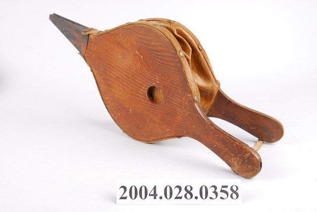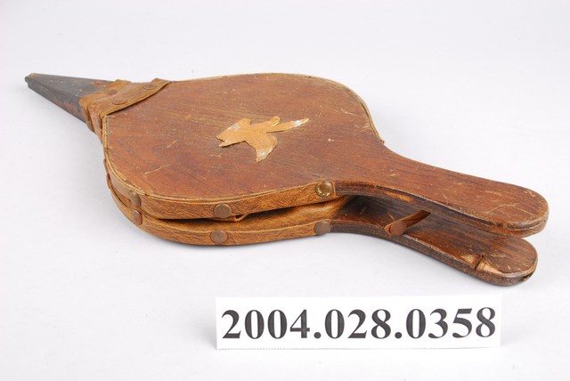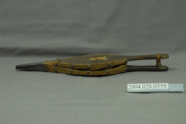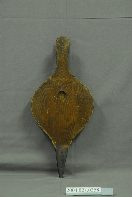 1.本物件為木製品,呈現上方圓形木頭,下方尖形鐵製品組成的方式,中間則為圓形木板,木板與鐵製品之間用鉚釘固定,木板上有一金黃色飛翔老鷹圖案。 2.用途:鼓風機俗稱「風鼓」,中間為圓形鼓風肚,上下壓後會有空氣出現,用途為當稻穀晒乾後,透過風鼓將虛殼吹除。