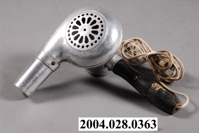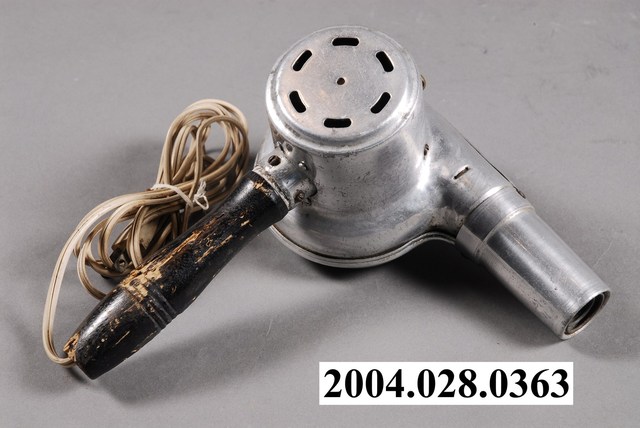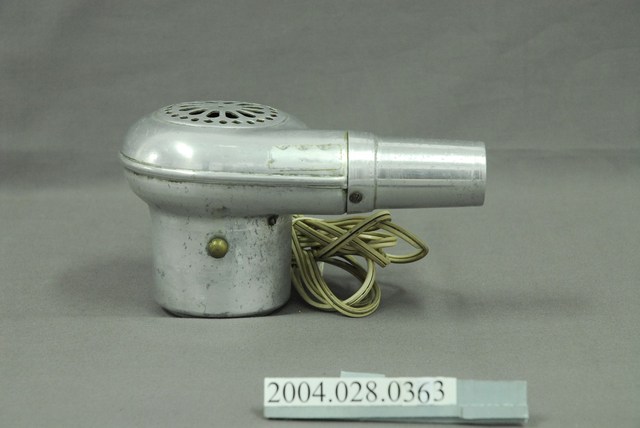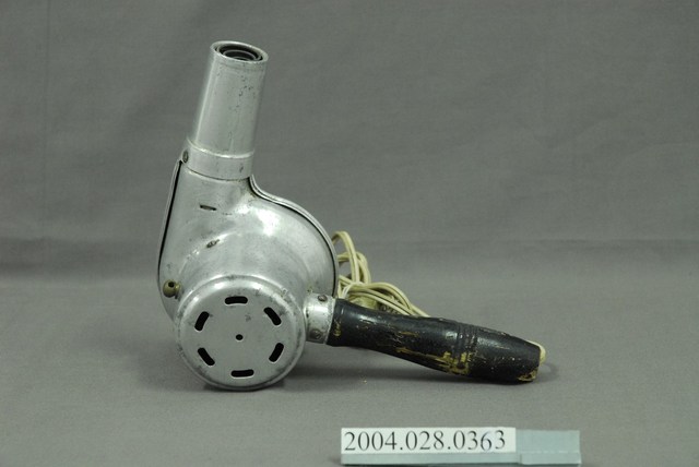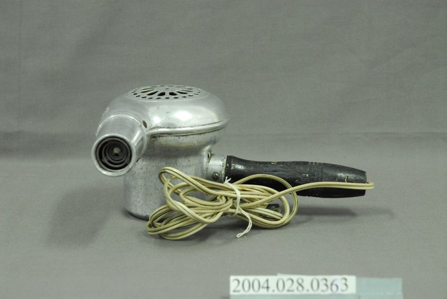 本文物為吹風機,由原鋁製作而成,為木製手把,吹風機、手把、以及電線的表面,多處有生鏽、污漬。此文物為當時主要的家電用品。
