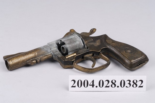 本物件為玩具手槍組件,共含槍身及子彈兩部分,整體為塑膠材質,槍身上金色漆,子彈周圍有明顯鏽蝕痕跡。