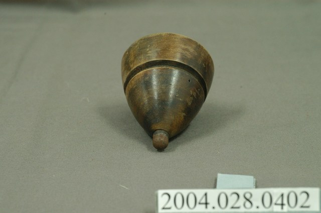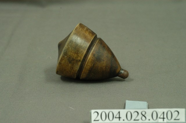 1. 木製陀螺,大小約8公分,頂部中央突起呈笠狀,肩部以下向底部收縮呈圓錐形,中央陰刻一圈尖角寬橫紋,底端錐尖處嵌有木質圓釘。陀螺通身呈深褐木頭原色,表面施一層透明漆,器身多處有使用磨損刮痕。2. 陀螺為華人社會中常見的童玩,中國宋代時就已經出現類色的玩具,名為「千千」,宋代畫家蘇漢臣的《嬰戲圖》作品中即可看到孩童玩耍陀螺的畫面。陀螺的玩法大多是以繩索纏繞後用力拋出使其旋轉,早期臺灣孩童多能自製陀螺,以蕃石榴樹、龍眼樹、九芎木和樟木等製成木陀螺,另外也有塑膠陀螺、鐵陀螺、響螺等不同材質的陀螺。