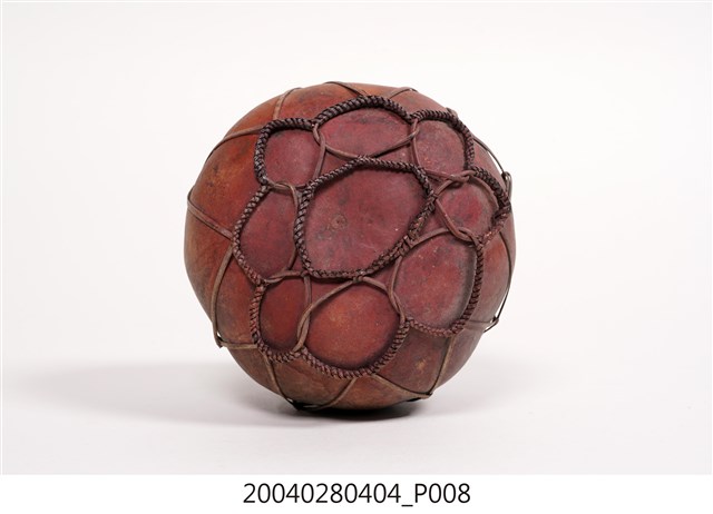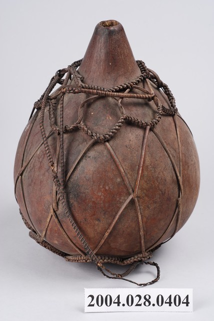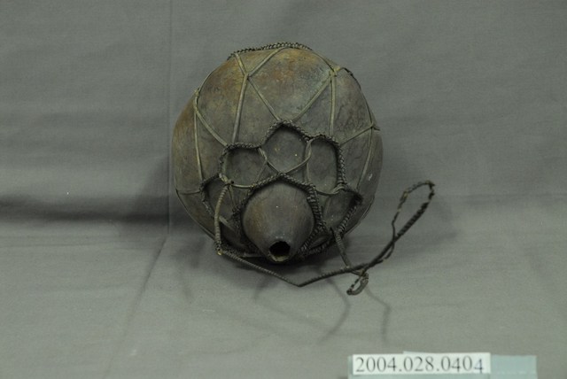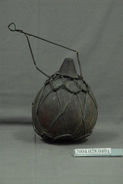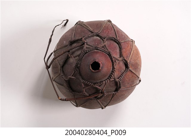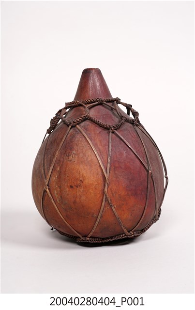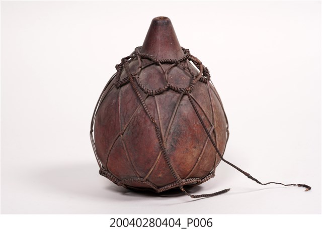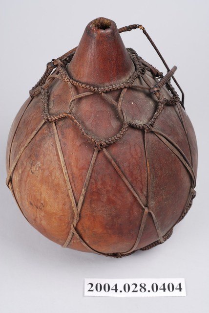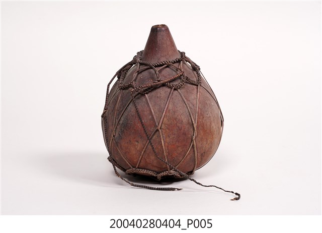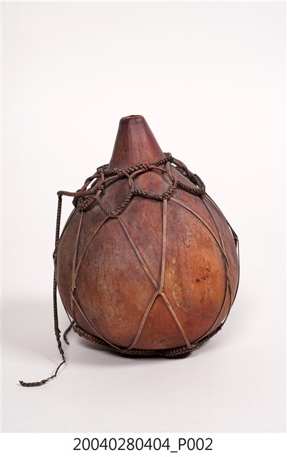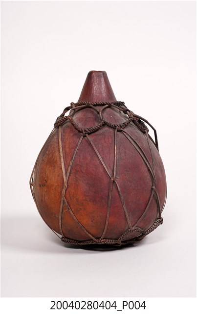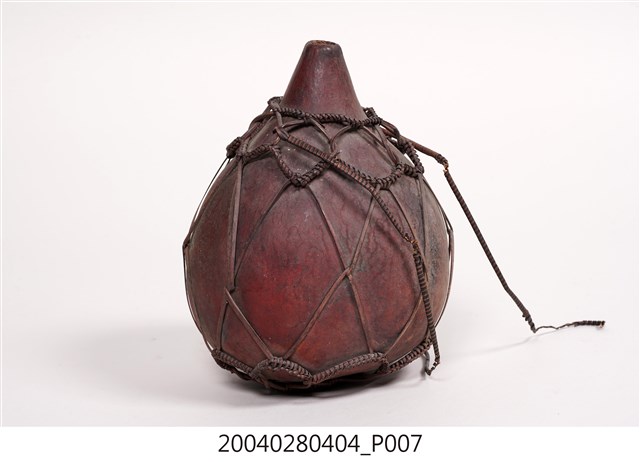 1. 本件為泰雅族葫蘆容器,為泰雅族人的盛水器具。器身呈紅褐色,係將天然的葫蘆上方截去一小段作為開口,曬乾煙燻後作為儲水容器,此外亦可作為酒壺之用。為了便於提取攜帶,器身外套有一籐篾與麻繩編織而成的提網。