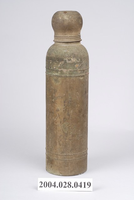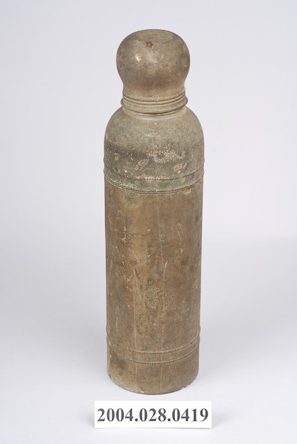 1.本物件為鐵製保溫瓶,瓶身為長圓桶型,含瓶蓋,瓶蓋似水母型,與瓶蓋接軌處開始往上方凸起,瓶身本無提把,整體有許多生鏽痕跡,瓶身4分之1與4分之3處,皆有兩個環繞瓶身之圓型設計。