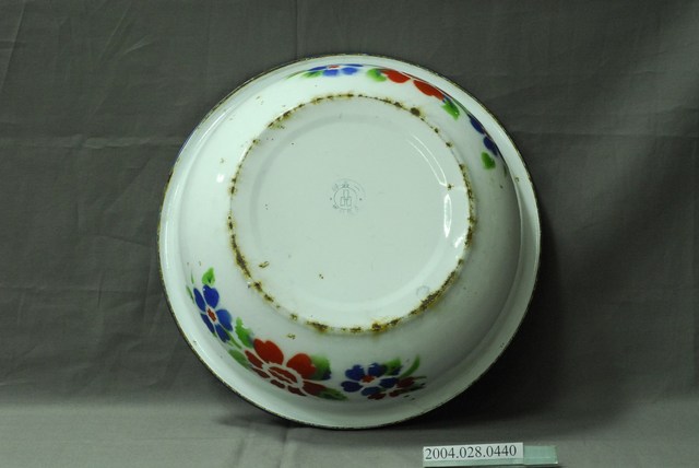 1.本件立茂琺瑯製喜上眉梢搪瓷臉盆,又稱面桶。以鐵金屬為胎體,表面與內面施以琺瑯釉料後燒製完成。外型呈上寬逐漸下窄之圓形深盆狀,口部折沿,邊緣帶有內捲圓唇,底部呈平底帶有圓環型底圈足。臉盆口緣以紅色裝飾,內面則裝飾有色彩鮮豔之牡丹花卉,以及梅枝與喜鵲圖案,具有富貴與喜上眉梢之涵義。器表外側則裝飾有花卉圖案,底面壓印有商標及立茂琺瑯.一品牌字樣。2.臉盆主要做為衛生盥洗,裝盛清水用於清洗臉部與手部。其材質多見於木製、銅製、搪瓷等,傳統常見與臉盆架做搭配。鋁製臉盆於常見於臺灣常民生活,其用途廣泛除原本盥洗之用,也常用於清洗或裝盛物品使用。
