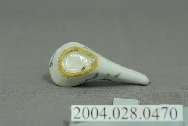 青花紋白瓷製湯匙。匙面前寬後窄,匙腹淺平,匙柄頗短;整體為白瓷湯匙上以青綠色塗繪出簡易抽象的花草紋,多在匙面上端的部份;匙面下端有一黃色圈足,相當粗糙,為燒製時接觸底部黏土所致。因年代久遠,匙面有一角已破損。