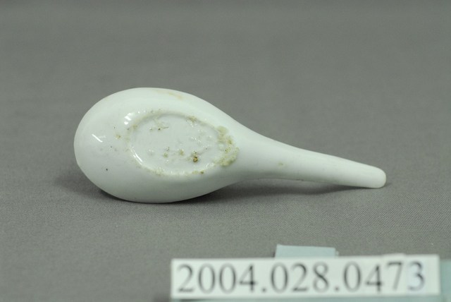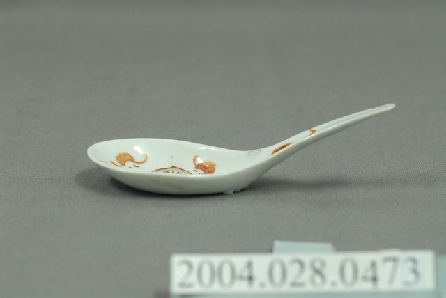 1.粉彩五蝠與壽字紋白瓷製湯匙。匙面偏橢圓形,匙腹淺平,匙柄與匙面等長,柄尾寬度明顯縮窄,用以減輕重量,方便靈活持握。整體為白瓷湯匙上端以紅綠兩色塗繪出簡易抽象的蝙蝠紋以及壽字紋。匙面下端有一圈粗糙不平整的圈足,且沾黏黃色污漬,此為燒製時接觸底部黏土所致。2.早期臺灣民間多有此類粉彩紋飾的湯匙,紋飾相當多樣,且具有吉祥寓意。由於瓷製品容易破損,加上工業化的發展,民國五十年代之後,瓷製湯匙逐漸為鋁製或不鏽鋼材質取代。