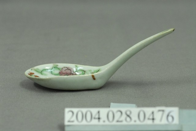 1.彩繪花朵果實壽字紋白瓷製湯匙。匙面偏橢圓形,匙腹淺平,匙柄與匙面等長,柄尾寬度明顯縮窄,用以減輕重量,方便靈活持握。整體為白瓷湯匙上以紅綠兩色塗繪出匙面底部的「壽」字,唇緣部分兩朵對稱的花,以及匙面前端與匙柄上延伸塗繪的果實圖案。匙面下部有一黃色圈足,相當粗糙,為燒製時接觸底部黏土所致。匙面上下部分皆有些許蛀釉孔。2.早期臺灣民間多有此類代表喜氣的彩繪紋飾的湯匙,紋飾相當多樣,且具有吉祥寓意;本件上的花朵象徵喜氣,壽字紋象徵長壽,果實紋象徵子嗣多幅。由於瓷製品容易破損,加上工業化的發展,民國五十年代之後,瓷製湯匙逐漸為鋁製或不鏽鋼材質取代。