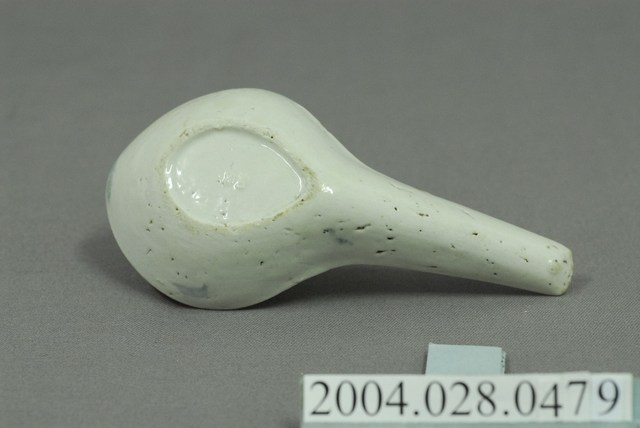 1.青花紋白瓷製湯匙。匙面前尖中寬,匙腹淺平,匙柄與匙面等長,柄尾寬度略微縮窄,用以減輕重量,方便靈活持握。整體為白瓷湯匙上,從匙面延伸至匙柄,以青灰色塗繪出簡易抽象的花朵紋,底部唇緣部分簡單勾勒出代表花瓣的線紋。匙面下部佈滿許多蛀釉裂孔,有一圈粗糙不平整的圈足,此為燒製時接觸底板所致。2.早期臺灣民間多有此類青花紋飾的湯匙,紋飾相當多樣,且具有吉祥寓意;本件上的花朵象徵喜氣。由於瓷製品容易破損,加上工業化的發展,民國五十年代之後,瓷製湯匙逐漸為鋁製或不鏽鋼材質取代。