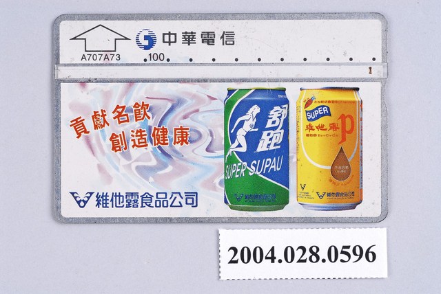 1.本物件為印有維他露食品公司廣告的電話卡,是1997年7月發行廣告卡,發行量16萬張。正面以彩色印刷,背景為一罐舒跑跟一罐維他露P,旁邊印有「貢獻名飲 創造健康」的標語,左上角印有箭頭插入方向符號,編號為A707A73,及印有中華電信的字樣及標誌,下方有一條銀色帶狀的設計,上方有顯示100的面額,卡片四周也以銀色為邊框,左下角印有「維他露食品公司」的字樣及標誌。