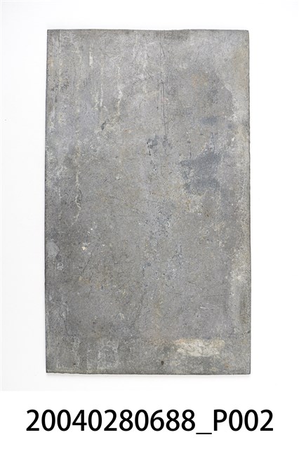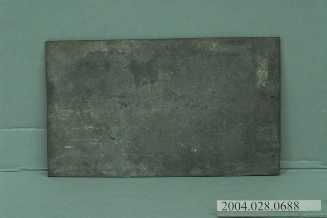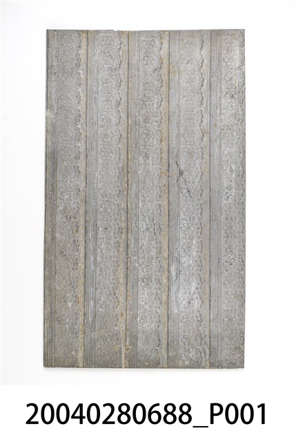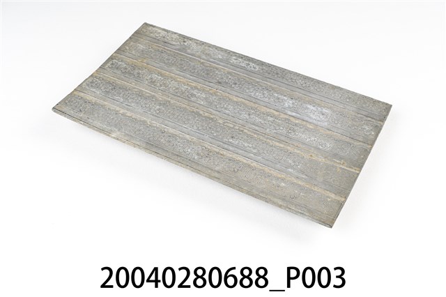1.本物件是一塊長方形鐵牌,背面底部平坦,正面有浮雕五組重複圖樣。每一組圖樣皆為連續性大小花朵呈帶狀排列,且五面環繞方形螺旋紋路外框。