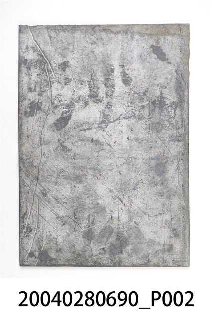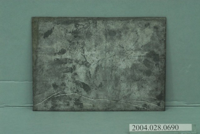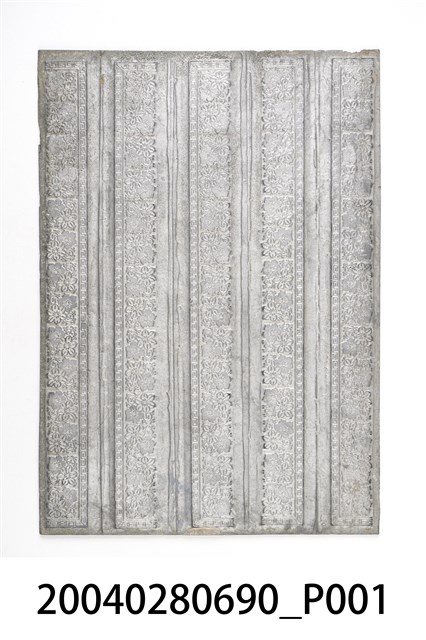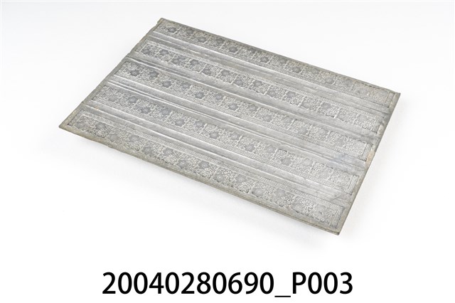 1.本物件是一塊長方形鐵牌,背面底部平坦有數條凹痕,正面有浮雕五組重複圖樣。每一組圖樣皆為連續性大小花朵呈帶狀排列,且三面環繞方形螺旋紋路外框。