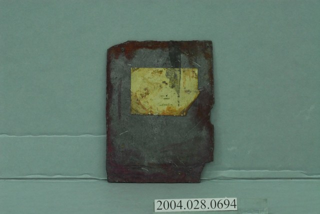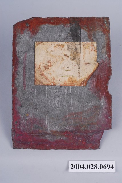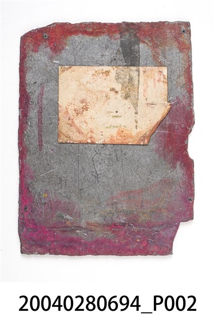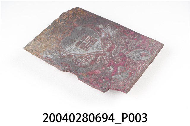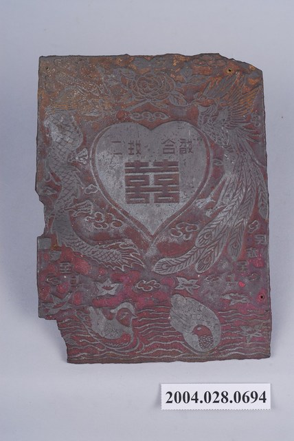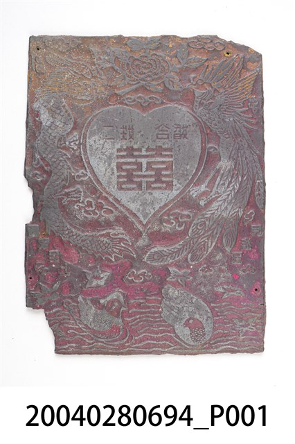 本件為十九世紀末到二十世紀初,在中國和臺灣流行的石版印刷,以在石板上陽刻圖紋,再加以印刷的方式,特點是印價便宜,缺點是數量有限,無法大量翻印。本件圖紋為中間心形內寫兩姓合婚及雙喜,外則飾以龍鳳圖紋及下方的鴛鴦戲水圖,象徵婚禮喜事。