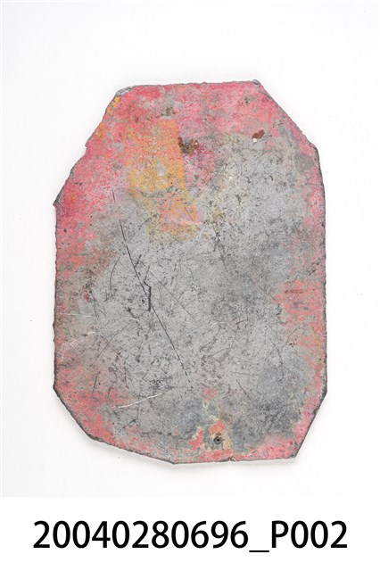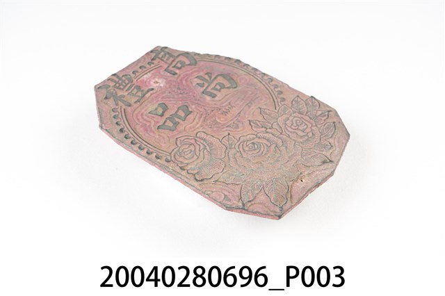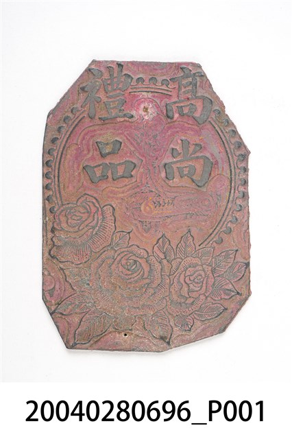 本件為十九世紀末到二十世紀初,在中國和臺灣流行的石版印刷,以在石板上陽刻圖紋,再加以印刷的方式,特點是印價便宜,缺點是數量有限,無法大量翻印。本件以陰刻「高尚禮品」以及陰刻牡丹花紋等,應是用於產品包裝或作為版印附件之用。
