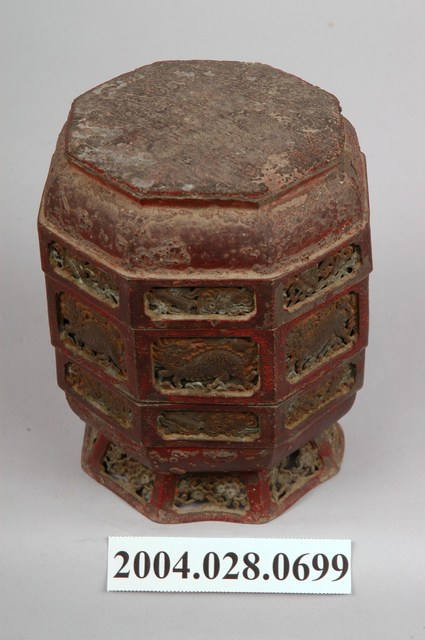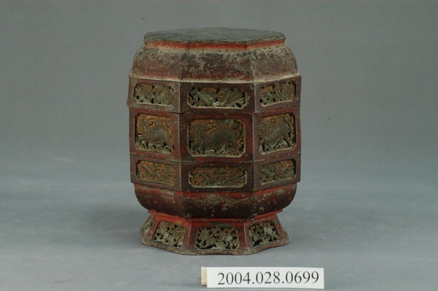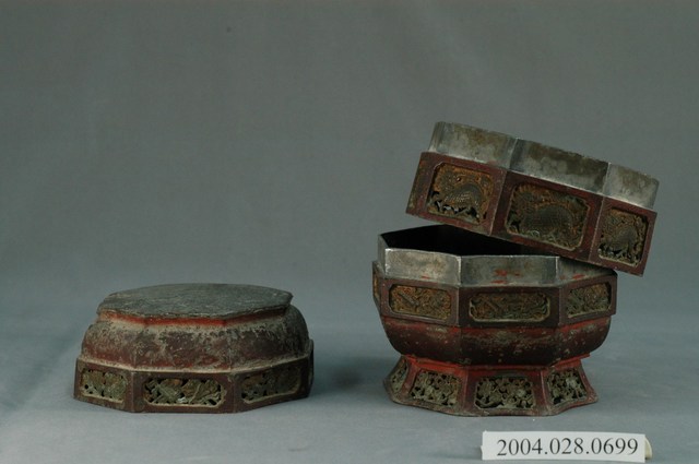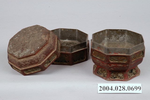 1. 本件粉盒為錫製雙層式,外觀為筒狀八角形,並上有朱漆;在八角形的側面共有四層窗花雕刻造型(從底部算起),最底層是花草紋飾,再來是書卷、蕉扇等圖樣,中間層最顯著即麒麟樣式的窗花,最上層則又是書卷、蕉扇等圖樣。2. 錫製粉盒是臺灣婦女常見的妝飾用品,用來收納胭脂、水粉等物品;外觀亦會雕刻傳統吉祥圖案作為裝飾,展現錫製藝術與日常文化的緊密,成為常民生活的品味。