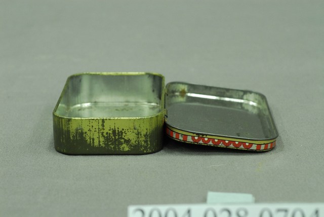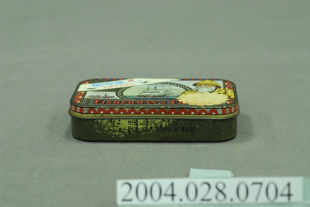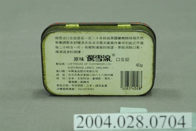 1.飛雪涼口含錠包裝鐵盒,扁長形掀蓋式,盒蓋長邊的一側與盒身以鉸鍊固定。盒蓋頂部中間印著一艘在海上航行的木造風帆船,右側有位叼根菸斗的白鬍子漁,左側印著一艘遊艇,寫著「LOFTHOUSE ORIGINAL」,下方印製有產品英文名稱「FISHERMAN'S FRIEND」,周邊飾以紅色小花的邊框。由於此產品是原裝進口,所以在盒蓋上以貼紙標示產品的中文名稱「飛雪涼口含錠」,以及產品特色等文字。盒底有貼紙簡短說明該產品研發的由來,以及產品名稱、製造商、進口商、進口商地址、成份、製造日期、有效期限、消費者服務專線