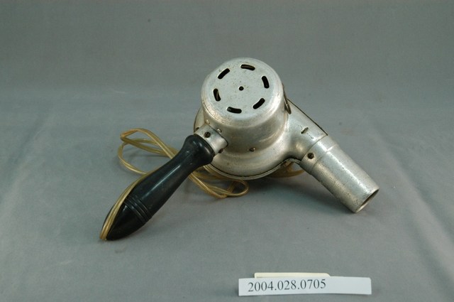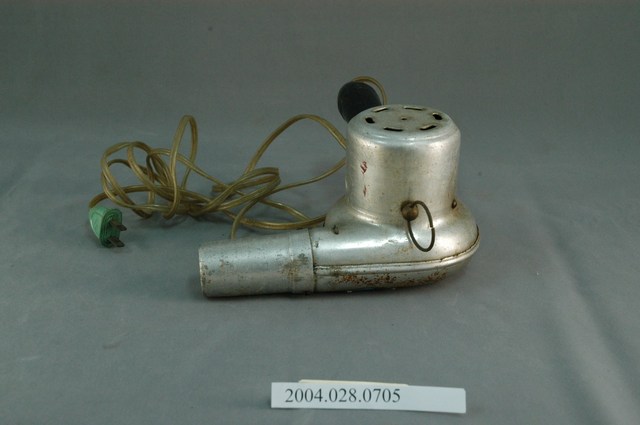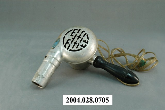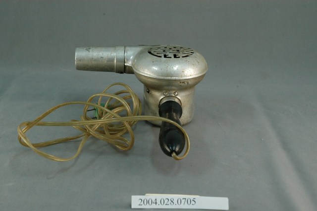 本文物為富士牌吹風機,由原鋁製作而成,吹風機上貼著一張標示寫「富士牌」,吹風機上的圓圈勾環,為掛式設計,便於收納。吹風機、電線以及插頭的表面,多處有生鏽、污漬。此文物為當時主要的家電用品。