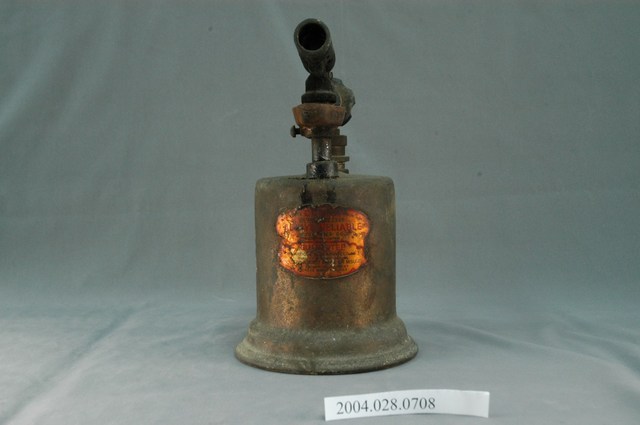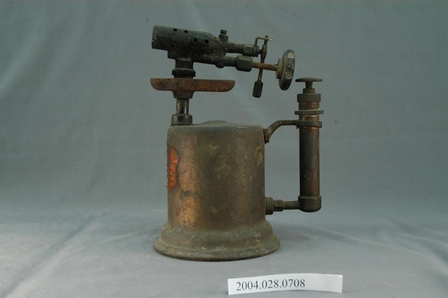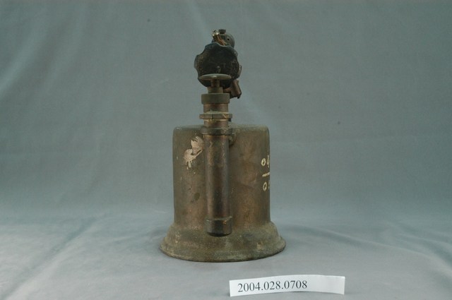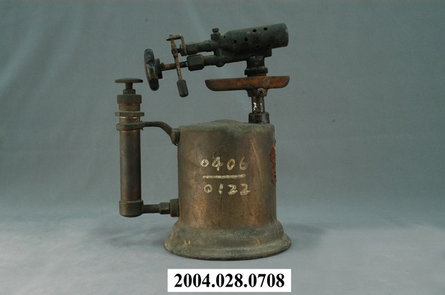 本物件為噴火器,金屬製品。就其外觀而言,有噴火口、調整火侯的轉軸、握把和帽型底座。帽型底座上有商標和製造資訊,但已模糊不清,另一面有0406下面一橫線0122的字樣。