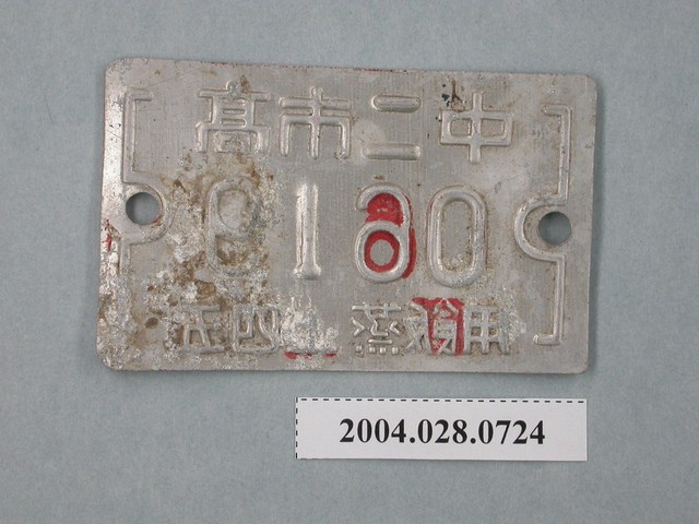 本件為高雄市第二中學蒸飯牌,金屬製,原持有人不詳,牌面上刻有「高市二中 0619 五四上 蒸飯用」字樣,根據「五四上」字樣,推測應指54學年度上學期,因此使用年份應為中華民國54-55年(1965-1966)。高雄市第二中學(今高雄市立前金國民中學),前身為民國35年(1946)創設之高雄市立第二初級中學,民國41年(1952)增設高中部,僅招收男學生,民國57年(1968)因應九年國民教育的實施,改名「高雄市立前金國民中學」,兼收男女學生。