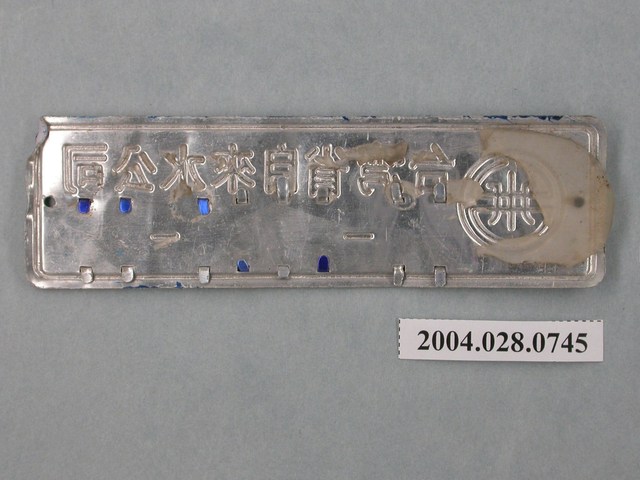 1.本物件為1金屬製的方形牌子,左右兩邊各有1個小洞,左邊的洞有汙漬沾染,正面上白色底漆,背面則無。文字是以鑄刻的方式呈現,並在正面有上不同顏色的漆,正面分成3個部分,整體而言有以藍色鑄刻方框框住,左邊為臺灣省自來水公司的標誌,右邊上半部鑄刻文字「臺灣省自來水公司」,下半部則為數字「24-0168-00」,但其中數字4、8為淡藍色的字,其餘數字則為深亮藍色。正面整體而言,除了數字之外,其他部位皆有所掉漆、斑駁。背面則以金屬原色為主,並留有文字的鑄刻痕跡,但也可以從此得知數字的部分,是另外有小零件再加上去的,並非跟著其他文字一起鑄刻上去,稍微可以看見背面有些藍色的痕跡,右邊則有一大片物體附著在上面,左邊的金屬稍微變形。