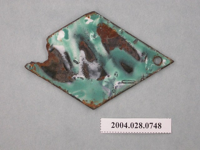 1.本物件為菱形鐵牌,其中一側有鑽圓形孔,另一側則有些許鏽蝕,牌上有白色「瓦」字及「116」字樣。