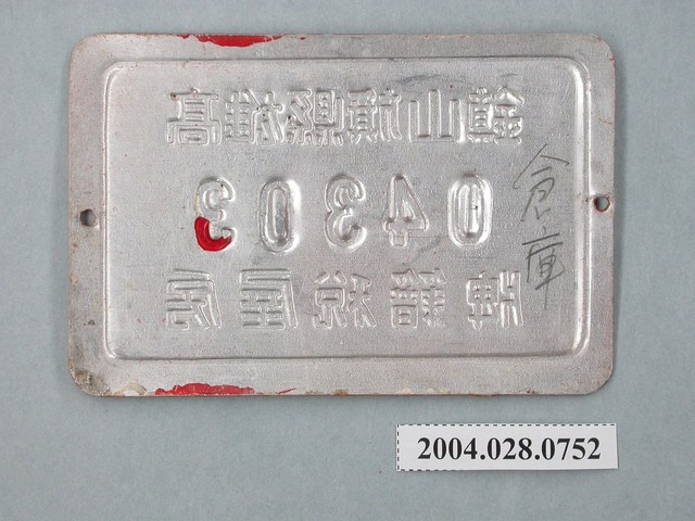 1. 本件高雄縣旗山鎮04303號房屋稅籍牌為鋁片沖壓製成,呈長方形、圓角,正面上漆,為紅底白色凸字,背面為凹字,無漆呈鋁金屬原色。正面圓角方框中壓印三排字樣,中段數字為稅藉編號「04303」,上、下段的中文字樣呈由右至左橫向排列,分別為:「高雄縣旗山鎮」及「房屋稅籍牌」,鋁牌左右兩側各有一個先前釘在門上的小孔。2. 早期臺灣房屋門口除門牌外,旁邊還釘有一塊房屋稅籍牌,證明這棟房屋已被編入稅籍當中。臺灣房屋稅的徵收歷史可追溯至清朝光緒年間,民國57年開始施行「房屋稅條例」,現今財政資訊均已電子化,房屋稅籍牌也走入歷史。
