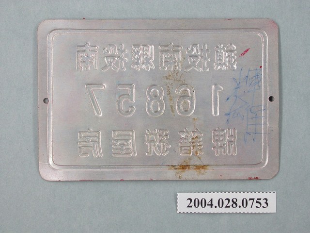 1. 本件南投縣南投鎮16857號房屋稅籍牌為鋁片沖壓製成,呈長方形、圓角,正面上漆,為紅底白色凸字,背面為凹字,無漆呈鋁金屬原色,右側以藍筆手寫「輝雄」兩字,可能為屋主名字。正面圓角方框中壓印三排字樣,呈由右至左橫向排列,中段數字為稅藉編號「16857」,上、下段的中文字樣呈由右至左橫向排列,分別為:「南投縣南投鎮」及「房屋稅籍牌」,鋁牌左右兩側各有一個先前釘在門上的小孔。2. 早期臺灣房屋門口除門牌外,旁邊還釘有一塊房屋稅籍牌,證明這棟房屋已被編入稅籍當中。臺灣房屋稅的徵收歷史可追溯至清朝光緒年間,民國57年開始施行「房屋稅條例」,現今財政資訊均已電子化,房屋稅籍牌也走入歷史。