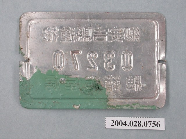 1. 本件花蓮縣吉安鄉03270號房屋稅籍牌為鋁片沖壓製成,呈長方形、圓角,正面上漆,為紅底白色凸字,漆料斑駁剝落,可見灰白色氧化痕跡,背面為凹字,無漆呈鋁金屬原色,其中一角及邊緣有灰綠色漆。正面圓角方框中壓印三排字樣,中段數字為稅藉編號「03270」,上、下段的中文字樣呈由右至左橫向排列,分別為:「花蓮縣吉安鄉」及「房屋稅籍牌」,鋁牌左右兩側各有一個先前釘在門上的小孔,皆以破損。2. 早期臺灣房屋門口除門牌外,旁邊還釘有一塊房屋稅籍牌,證明這棟房屋已被編入稅籍當中。臺灣房屋稅的徵收歷史可追溯至清朝光緒年間,民國57年開始施行「房屋稅條例」,現今財政資訊均已電子化,房屋稅籍牌也走入歷史。