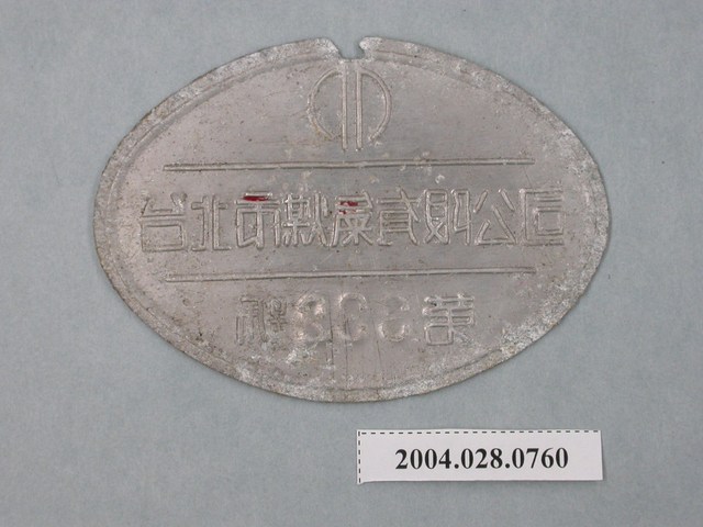 1.本物件為鐵製品,為橢圓形,上方有「臺北市煤氣有限公司 第332號」紅色字樣。