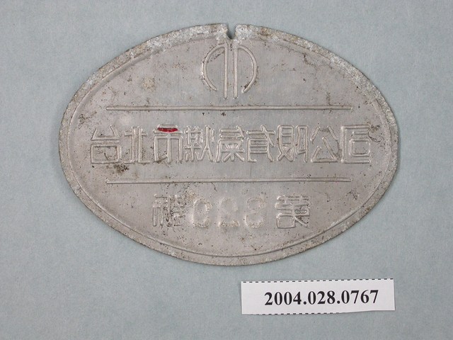 1.本物件為鐵製品,為橢圓形,上方有「臺北市煤氣有限公司 第328號」紅色字樣。