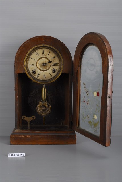 1. 日本製木雕雙獅戲球座鐘組,共1組3件,包括座鐘、鐘擺及發條鑰匙3個部分。座鐘盒體通身以木材製成,外觀呈半圓拱型,正面作單側右開門設計,門框表面以雙獅戲球及立柱為飾,框內夾帶繪有鳳凰展翅圖樣的透明玻璃。門內上半部半圓處嵌入圓形文字板,板上以羅馬數字指示時間,數字IIII(4)及VIII(8)旁有發條孔洞,數字VI(6)下方標有文字「MADE IN JAPAN」,數字XII(12)下方印有以彎弓及箭矢組成的商標圖案,商標上下左右印有文字「T」、「M」及「TRADE MARK」。鐘擺掛置於文字板後方的機芯之下,透過轉動鐘擺底部的螺帽,可以調整鐘擺長度,進而改變鐘擺擺動的速度。發條鑰匙用來插入文字板上的發條孔洞,藉由旋轉發條手動上鍊,給予座鐘走時的動力。2. 傳統的座鐘通常放置於桌面或櫃面等平面上,透過掛置於機芯下方的鐘擺左右擺動,帶動指針規律轉動來計算時間。臺灣從日本時代開始引進格林威治標準時間及星期制,推動民眾養成守時觀念與習慣,進而促使時鐘逐漸普及於民間。日本時代的時鐘大多為木造盒體,內頭機芯由日本廠商製成,大致可分為原裝進口及臺灣組裝兩種類型。做工精良的座鐘兼具顯示時間及裝飾環境的功能。