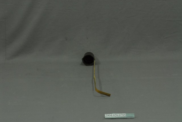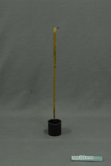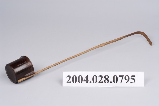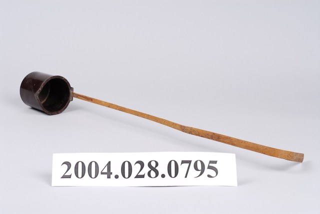 1.本物件為舀酒勺,應為鐵製,長約40公分,保存良好。主要型制為底下為一直筒狀的容器,於杯緣連接長竹勺柄,竹柄最上方則向下彎,以便拿取或吊掛。