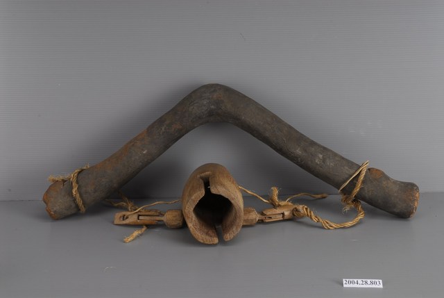 1.此為木製品,有一根灣區大木棍,另外有木製鈴鐺,及木製敲打器,再由麻繩將其鈴鐺與敲打器綁於彎曲大木棍上。