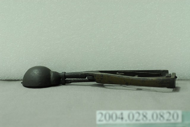 1.銅製挖冰器,較一般尺寸略大。杓面呈半圓形凹碗狀,握把為三角形;杓面與握把間有明顯錫焊接痕跡,握把底部有連接刮條棒的齒輪連動結構,頂部以圈環箍住刮條棒;刮條呈半圓弧狀,可在杓面內部來回滑動以刮除挖入的冰球;握把內側各有固定彈簧的凹槽與凸欄,用以固定倒V字型的彈簧。因年代久遠,整體呈現氧化變黑的情況。2.此種舀冰杓為臺灣早年販賣桶裝冰品(俗稱芋仔冰或叭噗)的必要工具。使用時以杓面將冰品挖成球狀後,再將把手向內側擠壓,即可將冰球刮除脫離。此類銅製舀冰杓皆為手工打製而成,後多為不鏽鋼機器製,但刮除效果不如銅質好。現今仍有少數販賣傳統冰品店家持續使用銅製冰杓的現象。