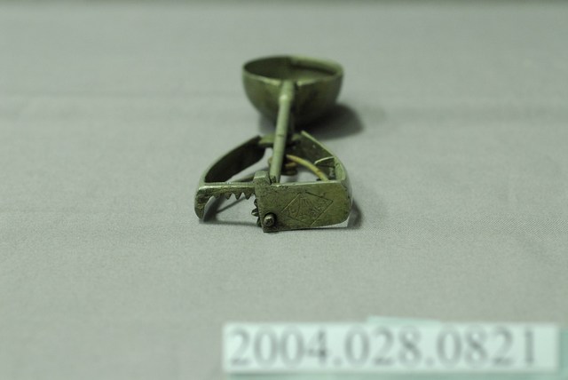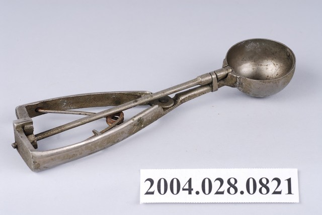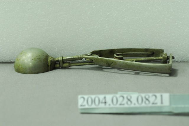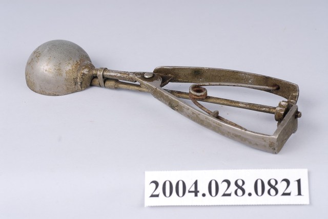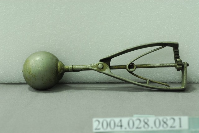 1.尺寸編號14的挖冰器,屬常見的尺寸。杓面呈半圓形凹碗狀,握把為三角形;杓面與握把間有明顯錫焊接痕跡,握把底部有連接刮條棒的齒輪連動結構,頂部以圈環箍住刮條棒;刮條呈半圓弧狀,可在杓面內部來回滑動以刮除挖入的冰球;握把內側各有固定彈簧的凹槽與凸欄,用以固定倒V字型的彈簧。因年代久遠,整體呈現泛黃斑駁感,握把間的鐵製彈簧有生鏽情況。此件舀冰杓握把底部外側刻有菱形框邊的「彰化富士」字樣與富士山圖像,屬於該冰杓製作者的落款。2. 此種舀冰杓為臺灣常見用來舀挖桶裝冰品的用具,店家或自家使用皆可見。使用時以杓面將冰品挖成球狀後,再將把手向內側擠壓,即可將冰球刮除脫離。