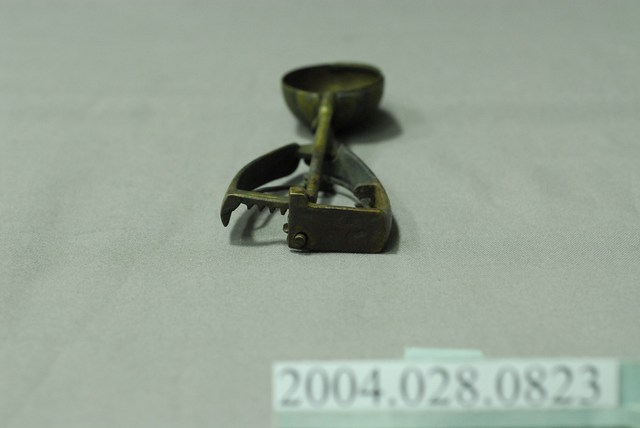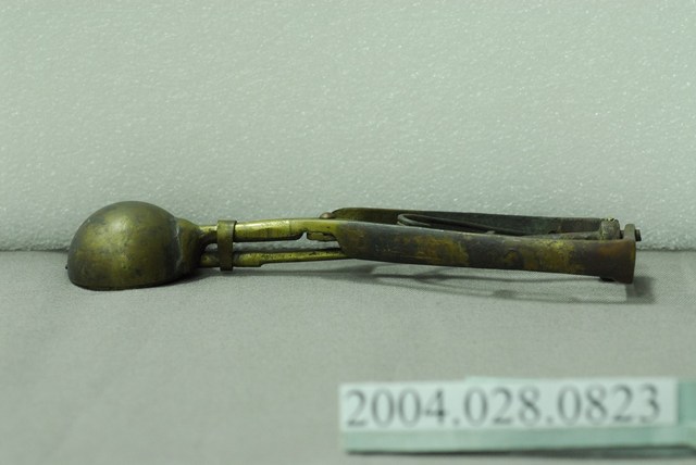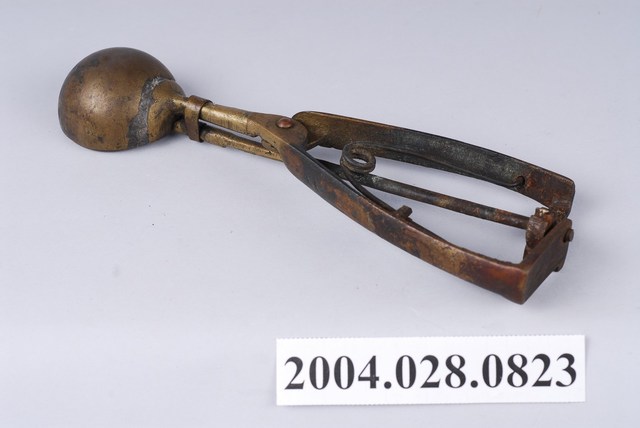 1.銅製挖冰器。杓面呈半圓形凹碗狀,握把為三角形;杓面與握把間有明顯錫焊接痕跡,握把底部有連接刮條棒的齒輪連動結構,頂部以圈環箍住刮條棒;刮條呈半圓弧狀,可在杓面內部來回滑動以刮除挖入的冰球;握把內側各有固定彈簧的凹槽與凸欄,用以固定倒V字型的彈簧。因年代久遠,握把與杓面處有些許銅鏽痕跡,整體多處呈現氧化變黑的狀況。此件舀冰杓握把底部外側刻有「彰化永安」字樣,屬於該冰杓製作者的落款,現已停產。2.此種舀冰杓為臺灣早年販賣桶裝冰品(俗稱芋仔冰或叭噗)的必要工具。使用時以杓面將冰品挖成球狀後,再將把手向內側擠壓,即可將冰球刮除脫離。此類銅製舀冰杓皆為手工打製而成,後多為不鏽鋼機器製,但刮除效果不如銅質好。現今仍有少數販賣傳統冰品店家持續使用銅製冰杓的現象。