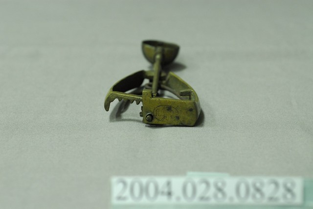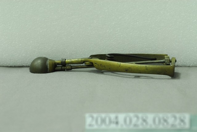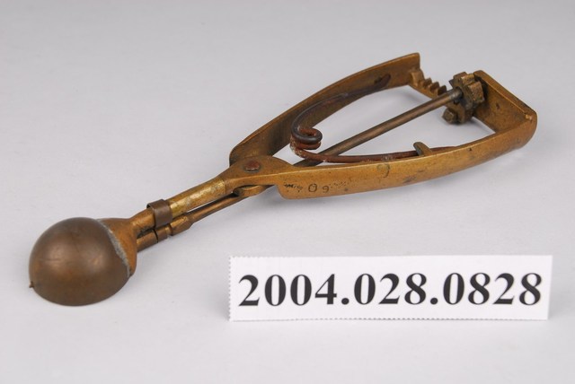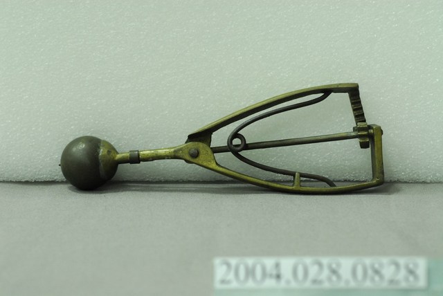 1.尺寸編號09的銅製挖冰器,較一般尺寸略小。杓面呈半圓形凹碗狀,握把為三角形;杓面與握把間有明顯錫焊接痕跡,握把底部有連接刮條棒的齒輪連動結構,頂部以圈環箍住刮條棒;刮條呈半圓弧狀,可在杓面內部來回滑動以刮除挖入的冰球;握把內側各有固定彈簧的凹槽與凸欄,用以固定倒V字型的彈簧。因年代久遠,杓面與刮棒處有些許氧化變黑,握把間的鐵製鐵製彈簧有生鏽情況。此件舀冰杓握把底部外側刻有橢圓形虛線框邊的「彰化恊和」字樣,屬於該冰杓製作者的落款,現已停產。2.此種舀冰杓為臺灣早年販賣桶裝冰品(俗稱芋仔冰或叭噗)的必要工具。使用時以杓面將冰品挖成球狀後,再將把手向內側擠壓,即可將冰球刮除脫離。此類銅製舀冰杓皆為手工打製而成,後多為不鏽鋼機器製,但刮除效果不如銅質好。現今仍有少數販賣傳統冰品店家持續使用銅製冰杓的現象。