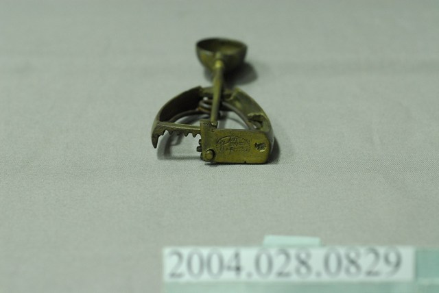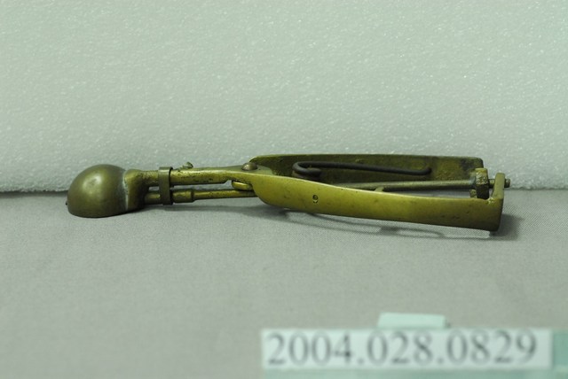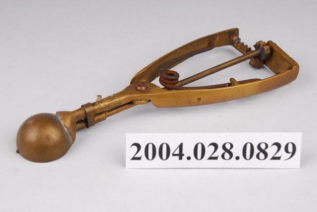 1.尺寸編號9的銅製挖冰器,較一般尺寸略小。杓面呈半圓形凹碗狀,握把為三角形;杓面與握把間有明顯錫焊接痕跡,握把底部有連接刮條棒的齒輪連動結構,頂部以圈環箍住刮條棒;刮條呈半圓弧狀,可在杓面內部來回滑動以刮除挖入的冰球;握把內側各有固定彈簧的凹槽與凸欄,用以固定倒V字型的彈簧。因年代久遠,杓面與刮棒處有些許氧化變黑與銅鏽,握把間的鐵製鐵製彈簧有生鏽情況。此件舀冰杓握把底部外側刻有橢圓形虛線框邊的「彰化恊和」字樣,屬於該冰杓製作者的落款,現已停產。2.此種舀冰杓為臺灣早年販賣桶裝冰品(俗稱芋仔冰或叭噗)的必要工具。使用時以杓面將冰品挖成球狀後,再將把手向內側擠壓,即可將冰球刮除脫離。此類銅製舀冰杓皆為手工打製而成,後多為不鏽鋼機器製,但刮除效果不如銅質好。現今仍有少數販賣傳統冰品店家持續使用銅製冰杓的現象。