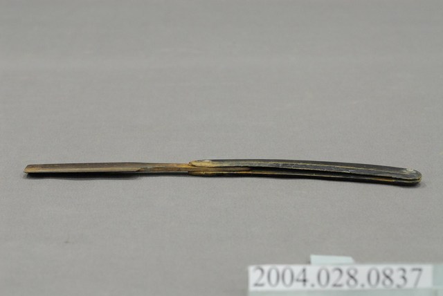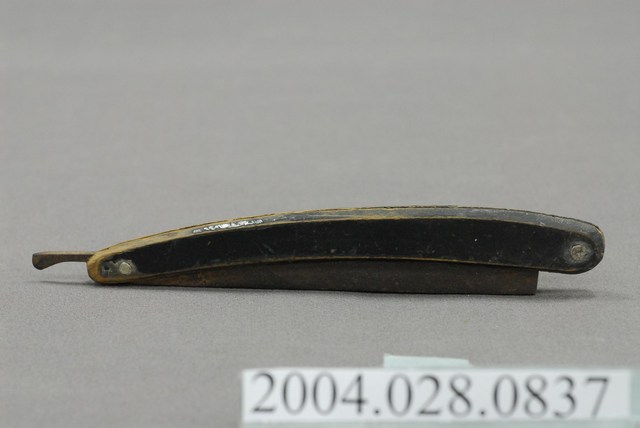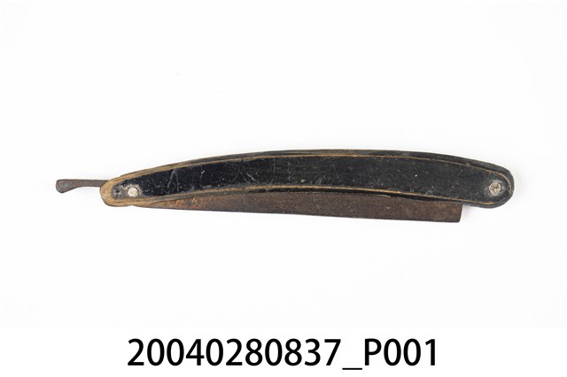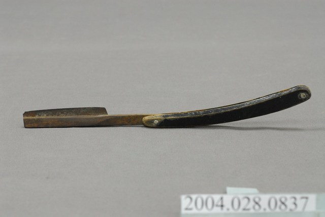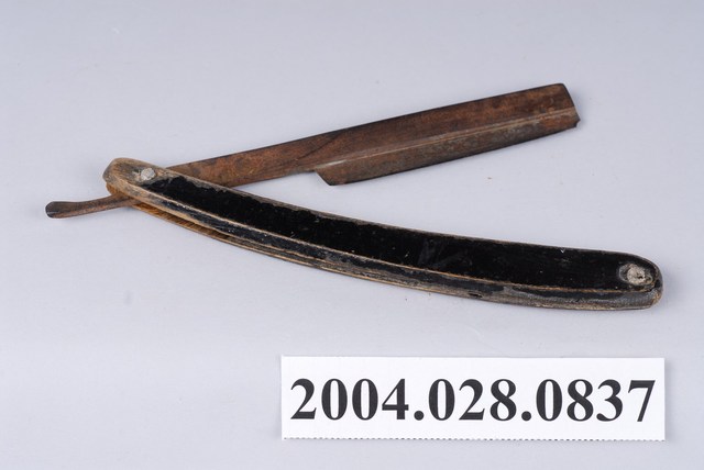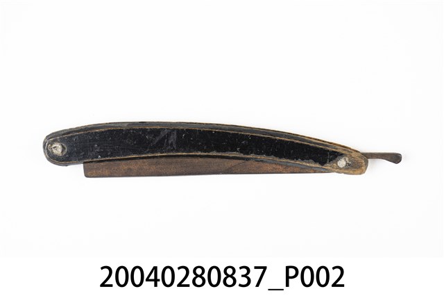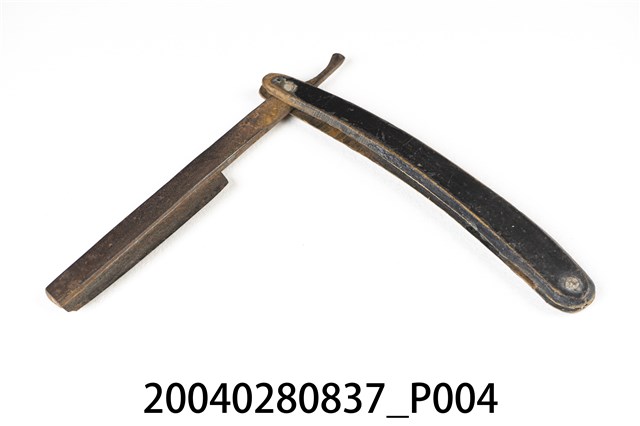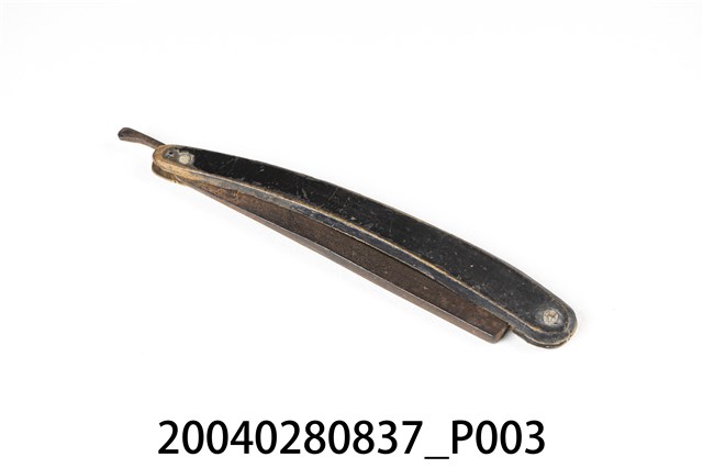 1.本件黑色木柄直式剃刀可分為刀身與刀柄2部分,呈長23.5公分,寬2.7公分,高0.8公分,為傳統刮鬍刀樣式。刀身以鐵打造而成,表面呈深褐色,且帶有黃褐色鏽斑,外型為厚脊長條形片狀,前端長邊作斜切後,延伸出薄形刀鋒,其兩側面研磨後作單邊兩面開鋒,尾端成條形起翹。刀柄以2片黑色木材製成,並於兩端點鑽孔插入金屬鉚釘後,一端與刀身固定。刀柄採夾合方式使之中央帶有溝槽可摺疊收納剃刀。刀柄前端與邊緣處因長時間磨損,而露出木材原色。2.傳統的刮鬍刀具為直式剃刀,由於剃刀過於鋒利且難以自行處理,男性大多需要到理髮店鋪請專業的理髮師修整鬍鬚,除修整鬍鬚之外,還可作剃髮使用。