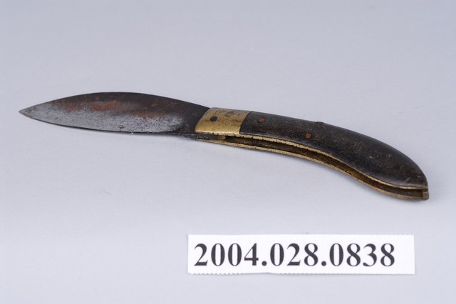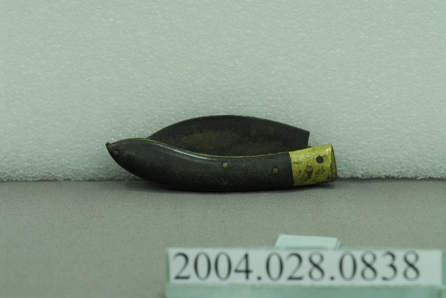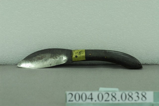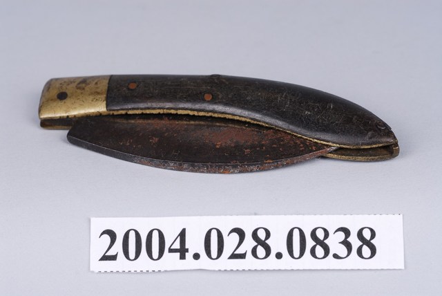 1.本物件是臺灣傳統的折疊小刀。刀身如竹葉狀,刀身可折疊收入刀柄中;刀柄形如茄子,刀柄外覆以牛角,兩側包銅。