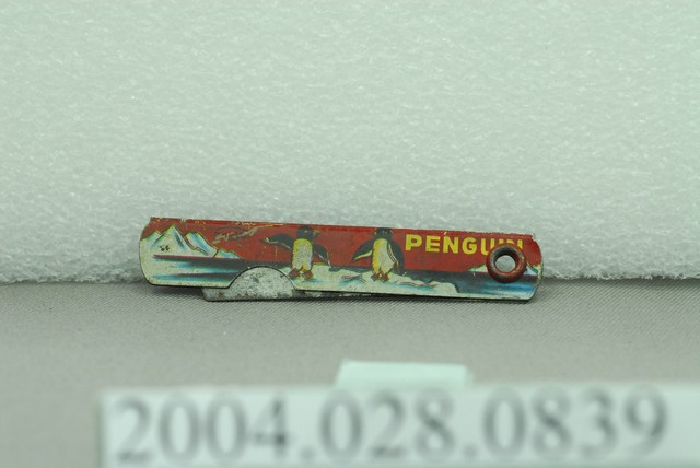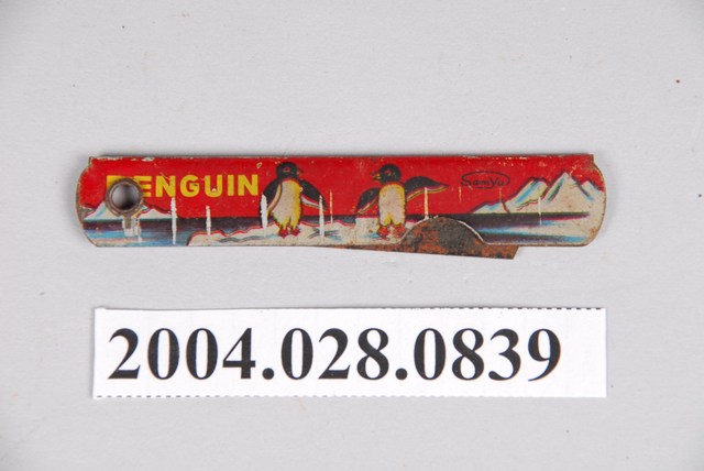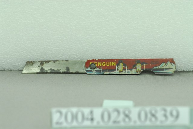 本文物為鐵皮小刀,印有兩隻企鵝與英文PENGUIN,右上角有Sam yu字樣。刀外有上下摺疊的鐵皮保護,也能保護使用者收納時的安全,關節處為一小孔,連結刀與護套。護套為鐵製。