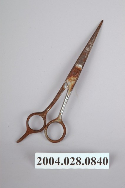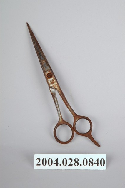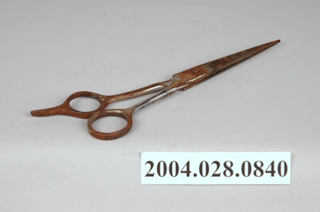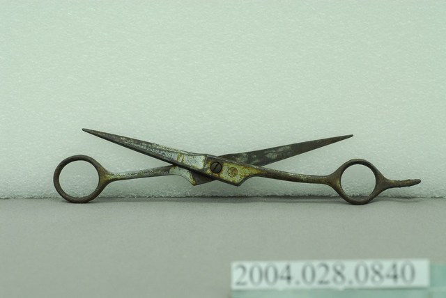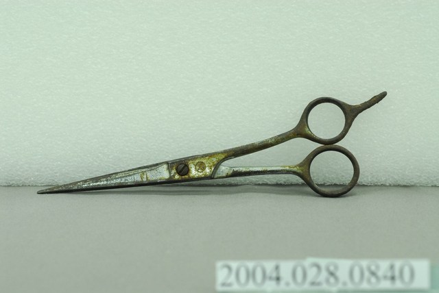 本文物為理髮剪,為理髮工具。剪刀運用槓桿原理,刀片於斜面刀刃後端交叉,以可活動螺絲固定,螺絲後端為刀柄。理髮剪的刀刃長而薄,一刀柄後端做彎勾,可挑起髮束,為理髮剪的特色。