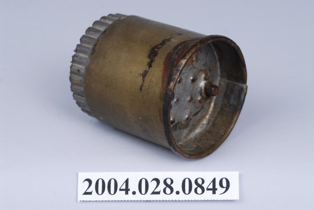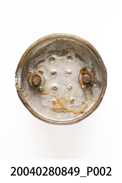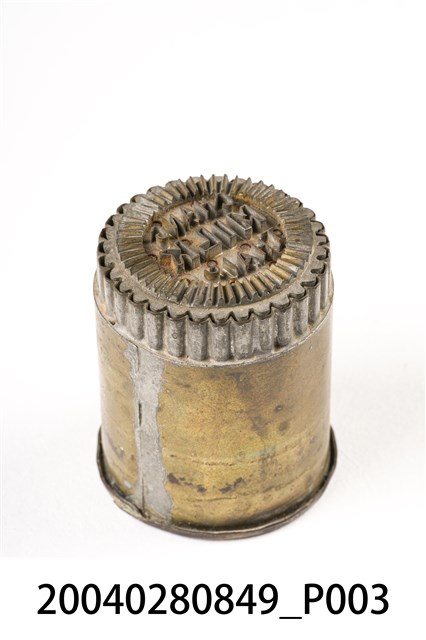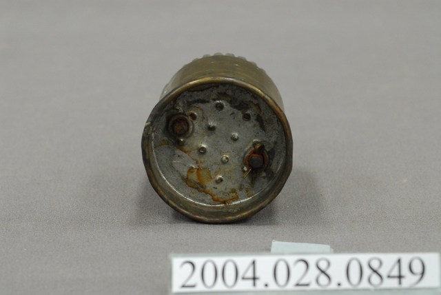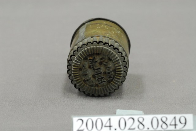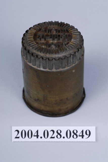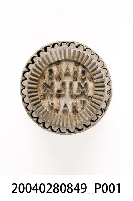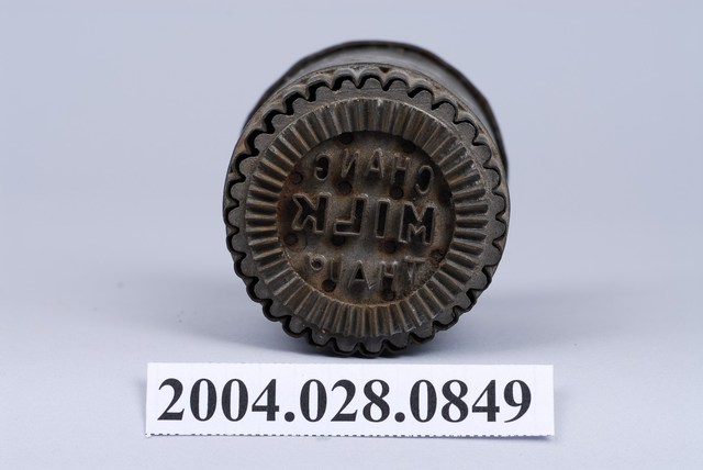 1.圓形壓製餅乾麵皮形狀的模具,材質主要以鋅、鐵構成,邊壁有明顯的接合痕跡。壓模底部外框是多道弧形構成的花邊;底部模面鑄有一圈放射狀凸狀結構,中間鑄有「CHANG」、「MILK」、「THAI」等字樣,應為店家名稱與餅乾口味。壓模頂部有兩個凸起螺絲,用來鎖住內部彈壓結構的彈簧。整體模具因年代稍久且保存不善,呈現多處鏽蝕且模面鑄字有缺損狀況。2.此類模具常見於製作餅乾的店家,使用時以蓋章方式將模具壓餅乾麵皮上,內部的彈壓結構會使底部模面上縮,同時從十二個孔洞推出孔針壓入麵皮中,拿起模具後,模具的彈力使麵皮脫