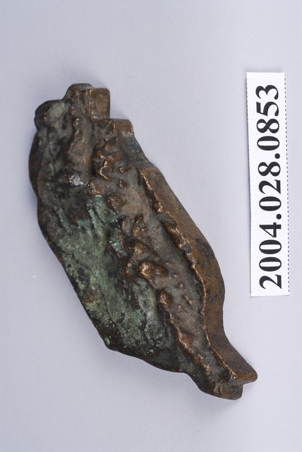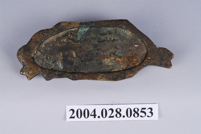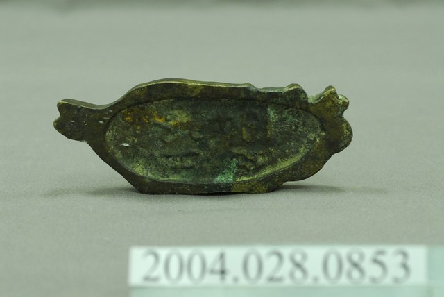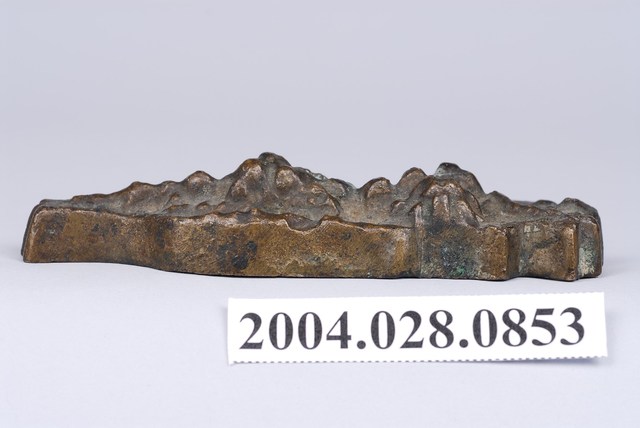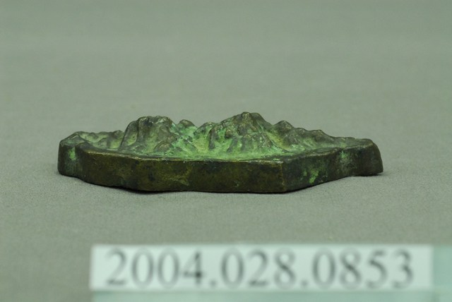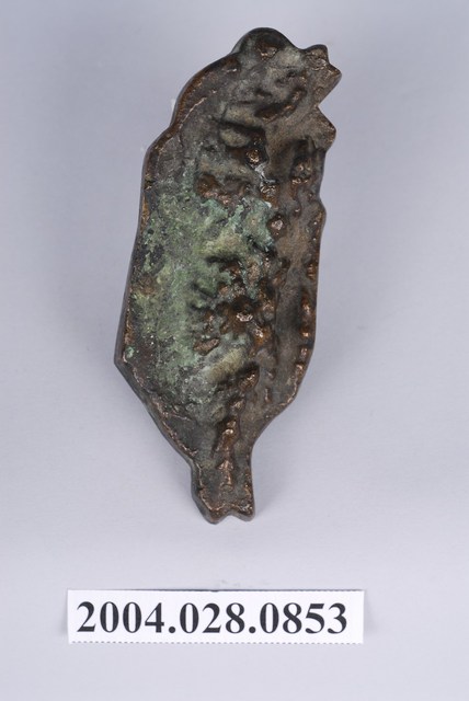 本文物有產生銅綠,判斷應為銅製文鎮,造型依照臺灣的形狀與地形來製作,把台灣的海岸線和山脈製作的非常精細,中央山脈清楚可見,本物件應為翻模的作品。