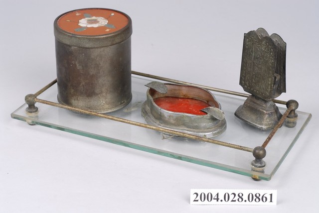 本物件為菸灰缸四件一組,為金屬及玻璃材質,包含圓型鐵罐、2個菸灰缸、菸灰缸盛盤。共4件。透明玻璃製方形盛盤,四角有金屬突起,以鐵桿相連成欄杆狀,金屬突起往下延伸形成四足。圓形金屬罐,底部向上翻後收口。罐蓋蓋沿本身為一中空環,內焊一圓形鐵板成蓋。鐵板上黏有等大的透明玻璃玻璃,玻璃內鑲嵌花裝飾。金屬製菱形煙灰缸,四邊成圓弧狀,似橢圓形,底部中間鑲一玻璃。兩側邊黏有金屬片形成凹槽,可放置煙。方形金屬器,有六邊形底座,上方為兩直立金屬片微向內凹,中間有一方形環。金屬片上有些印花裝飾。