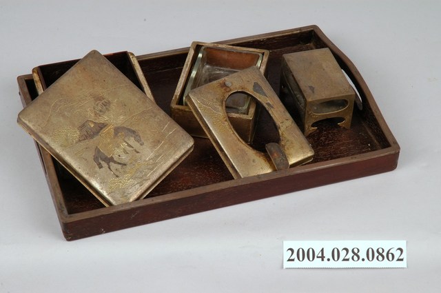 本物件為菸灰缸四件一組,為木質、金屬及玻璃材質,包含盛盤、煙盒、2個菸灰缸,共四件一組。木製方形盛盤,底部四邊緣稍突出成足,兩側邊中間鑿有一橢圓弧形的洞,可作為提拿之用,四邊頂端加裝一圈金屬薄片。金屬製方形煙盒,底座內層為木頭,底亦為木頭。四邊金屬口沿向外翻,內層木頭稍突出。盒蓋內層為木頭,蓋頂刻有一人牽一馬在河邊,馬低著頭要喝水,遠方有茅屋、樹、山景等。左下刻有「永廣刀」字樣。金屬製方形煙灰缸,底座內層為木頭,底亦為木頭。四邊金屬口沿向外翻,內層木頭稍突出。蓋內層為木頭,中間有一橢圓形洞,兩側有一橢圓金屬片,弄成凹槽狀可放置煙。