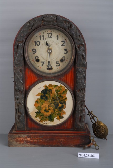 1. 日本尾張時計株式會社製八仙木座鐘組,共1組3件,包括座鐘、鐘擺及發條鑰匙3個部分。座鐘盒體通身以木材製成,外觀呈半圓拱型,正面作單側右開門設計,門框周圍繞以八仙造型銅片為飾,中央開有兩個圓形透孔,上半部加裝透明玻璃以顯示時間,下半部搭配彩繪花卉圖樣作為裝飾。門框與兩圓孔間的空隙原貼有四枚三角造型銅片,因年代久遠今已脫落。門內上半部半圓處嵌入圓形文字板,板上以阿拉伯數字指示時間,數字4及8旁留有發條孔洞,數字12下方印有日本尾張時計株式會社的商標圖樣。鐘擺掛置於文字板後方的機芯之下,透過轉動鐘擺底部的螺帽,可以調整鐘擺長度,進而改變鐘擺擺動的速度。發條鑰匙用來插入文字板上的發條孔洞,藉由旋轉發條手動上鍊,給予座鐘走時及報時的動力。2. 傳統的座鐘通常放置於桌面或櫃面等平面上,透過掛置於機芯下方的鐘擺左右擺動,帶動指針規律轉動來計算時間。臺灣從日本時代開始引進格林威治標準時間及星期制,推動民眾養成守時觀念與習慣,進而促使時鐘逐漸普及於民間。日本時代的時鐘大多為木造盒體,內頭機芯由日本廠商製成,大致可分為原裝進口及臺灣組裝兩種類型。做工精良的座鐘兼具顯示時間及裝飾環境的功能。3. 本件座鐘為日本尾張時計株式會社製造。該公司前身為創立於1894(明治27)年的「尾張時計製造合資会社」,1906(明治39年)改組為「尾張時計株式会社」,主要產品為掛鐘及鬧鐘。1939-1945年第二次世界大戰期間,改從事飛機零件及彈藥的製造。戰爭結束後,方重新生產掛鐘、鬧鐘及螺絲等產品。直至1962年再次更名為「尾張精機株式会社」後,以製造螺絲、汽車及飛機零件為主,停止掛鐘和鬧鐘的產線。