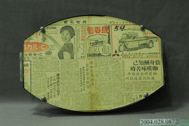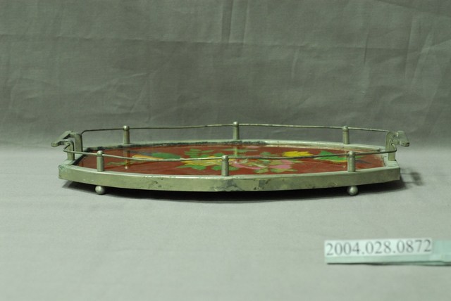 牡丹花鳥紋茶盤,以鋁金屬和琺瑯二種複合材質製成,茶盤框以鋁金屬製成,表面因氧化而呈深灰色,造型為中間寬二端窄的扁橢圓形,兩端平直,接有向上豎起之長條型把手,方便拿取,上下圓弧邊各作三個豎立圓柱,頂端作圓球狀並鑿有圓孔,金屬線從中穿過與二邊把手相接作為邊緣,避免放在茶盤中的茶杯掉落,盤底接有四小圓球作足,並貼有民國48年8月3日徵信新聞的報紙。盤面以琺瑯釉藥彩繪裝飾,以酒紅為底色,中央為盛開的牡丹花卉,帶有花開富貴之吉祥寓意,左右二邊各繪一隻小鳥,左方小鳥停歇樹梢,右方小鳥展翅飛翔,畫面活潑生動。