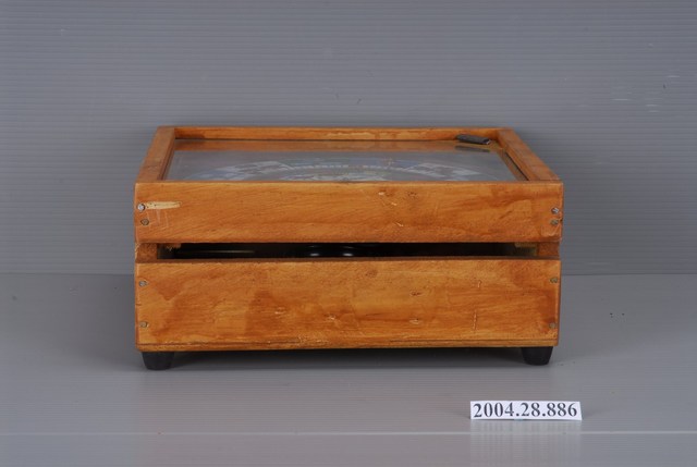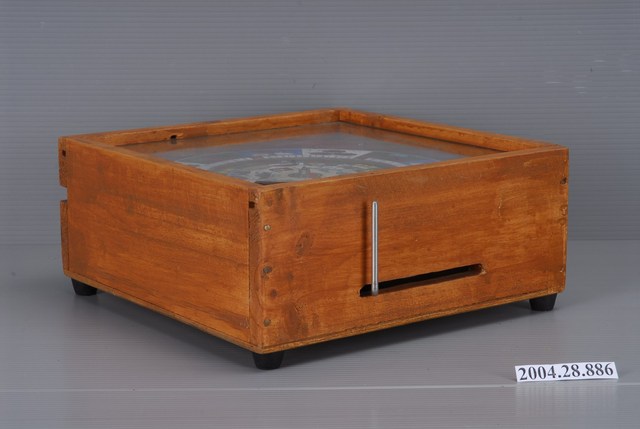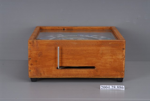 1.本物件為遊戲輪盤,木頭材質。該遊戲輪盤外觀為一個圓形轉盤放置於方形木頭方形容器內。該顏色繽紛的轉盤上可見十二生肖、物品、交通工具、數字,物品及交通工具的部分包括火箭、汽車、火船、電視、飛機、摩托車等;數字則為1至18。物件側面可見金屬拉把。