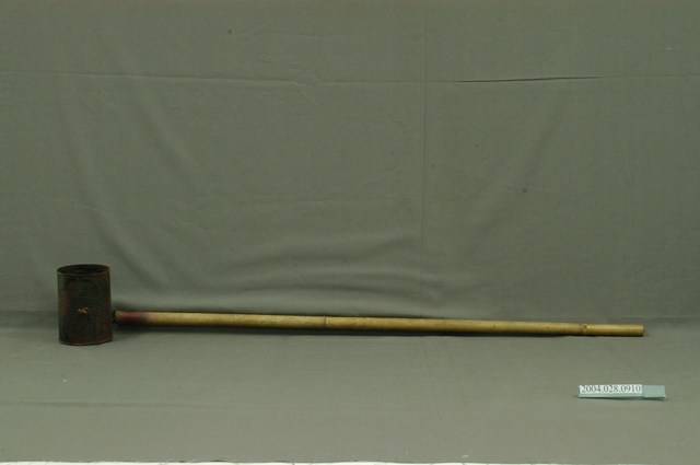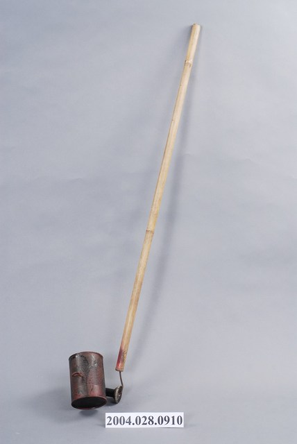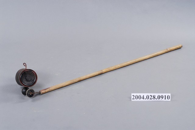 本物件為鐵罐之童玩,金屬材質。該鐵罐外觀為一隻細長的竹子,下方繫有鐵製圓柱狀罐子。該物件繫起竹竿、鐵罐的細線為金屬材質。